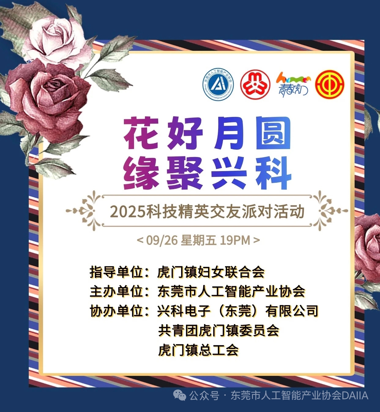 在国庆中秋双节即将到来之际,9月26日晚,由虎门镇妇女联合会指导、东莞市人工智能产业协会主办的“花好月圆 缘聚兴科”2025科技精英单身交友派对成功举办。本期交友活动共有29对青年男女报名参加,是由我会党支部继“三八”节之后组织的第二期单身浪漫约会,在美好的节日前夕相聚在兴科,把“爱”送到需要的人身边,把“情”溢满莞邑你我心间。