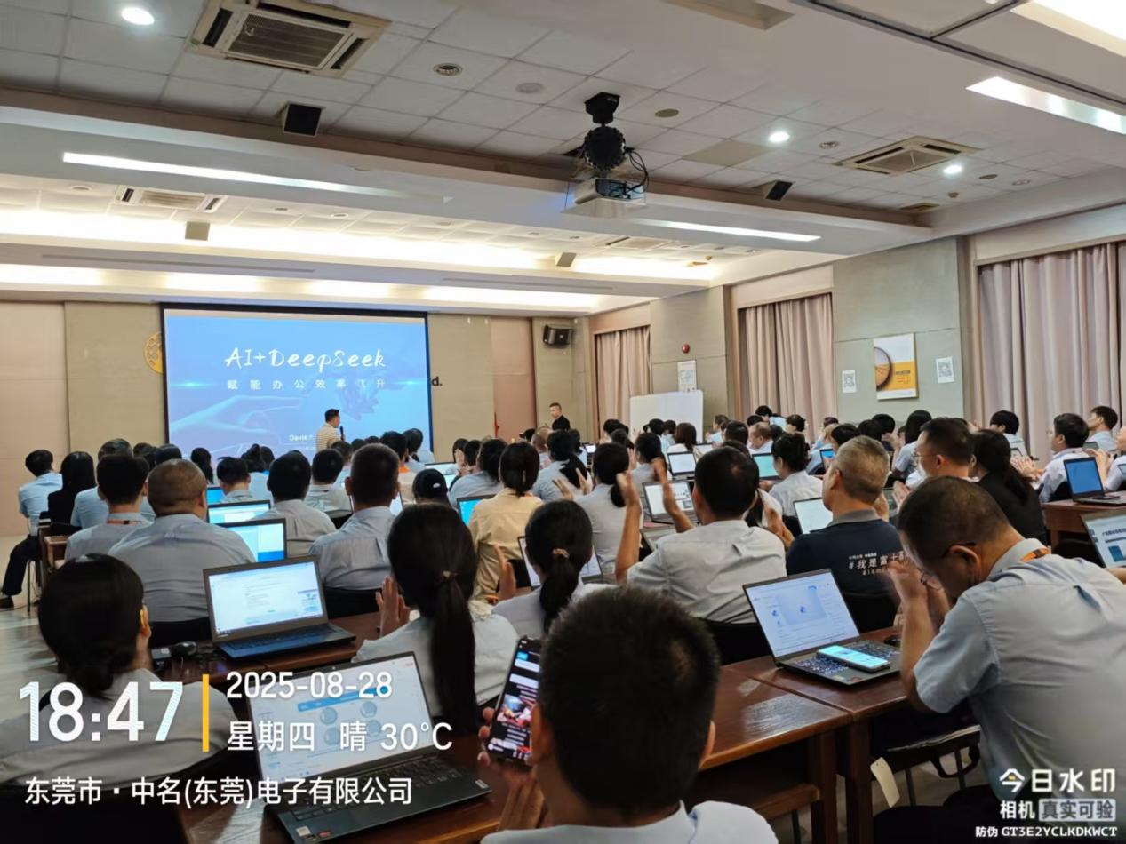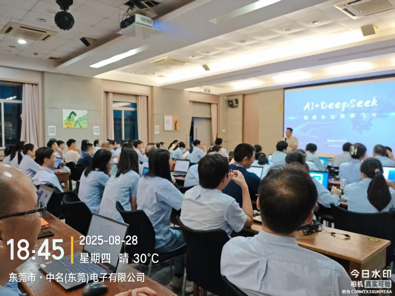 在人工智能技术迅猛发展的今天,AI已成为推动企业数字化转型和智能制造升级的核心驱动力。随着DeepSeek等先进AI工具的普及,中国企业正迎来一场效率革命。如何高效利用AI工具、避免“AI幻觉”、实现从个人到企业的全方位赋能,仍是许多组织面临的挑战。2025年8月28日,由东莞市人工智能产业协会培训委员会携手中名(东莞)电子有限公司成功举办了一场主题为《AI+智能制造:赋能未来办公新效率》的培训专题讲座。中名(东莞)电子有限公司100多名员工积极参与,本次培训反响非常好,得到了领导及员工的一致好评。